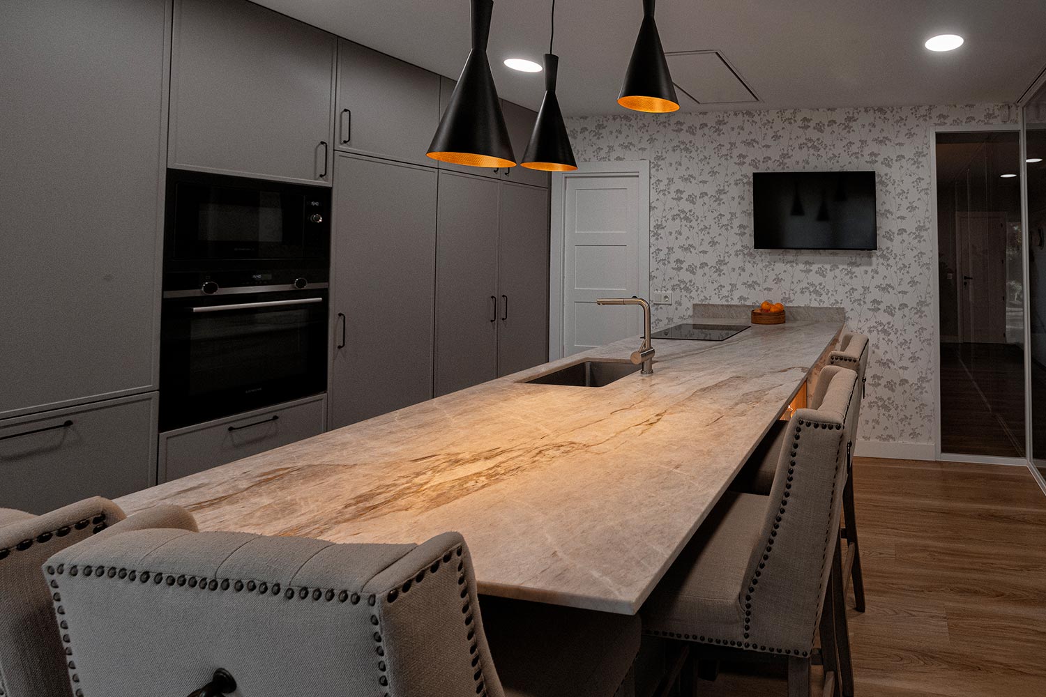 Como en la mayoría de nuestros proyectos, los materiales nobles están muy presentes. En este caso, la extensa encimera es la principal protagonista, fabricada a partir de piedra natural Taj Mahal. Se trata de un material muy resistente y de gran durabilidad, que destaca por la belleza de su veteado natural en tonos suaves, invitando al tacto y a detenerse a apreciar cada detalle. ¡Sin duda, un elemento capaz de atraer todas las miradas!