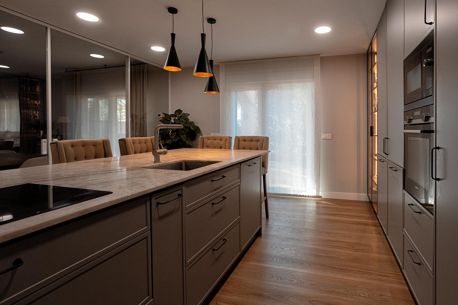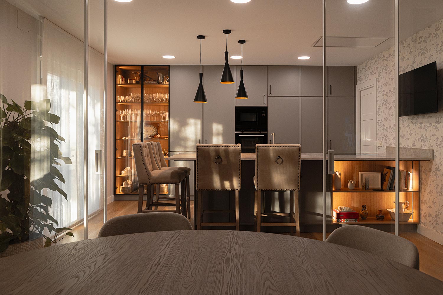 Con este proyecto hemos querido reflejar un estilo moderno con influencias minimalistas, donde predominan las líneas limpias y una combinación de materiales nobles. Y aquí es donde han entrado en juego los lacados suaves o la piedra natural Taj Mahal, el pavimento en tonos madera y la iluminación indirecta en varias zonas de la cocina, así como en las estanterías y vitrinas.