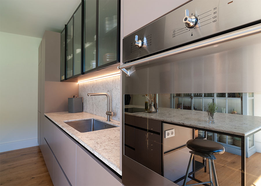 Para la encimera y el frente se optó por la piedra natural, concretamente granito en un acabado abujardado que, integrada en el conjunto, ofrece una estética con un gran carácter que transmite armonía y gratas sensaciones.